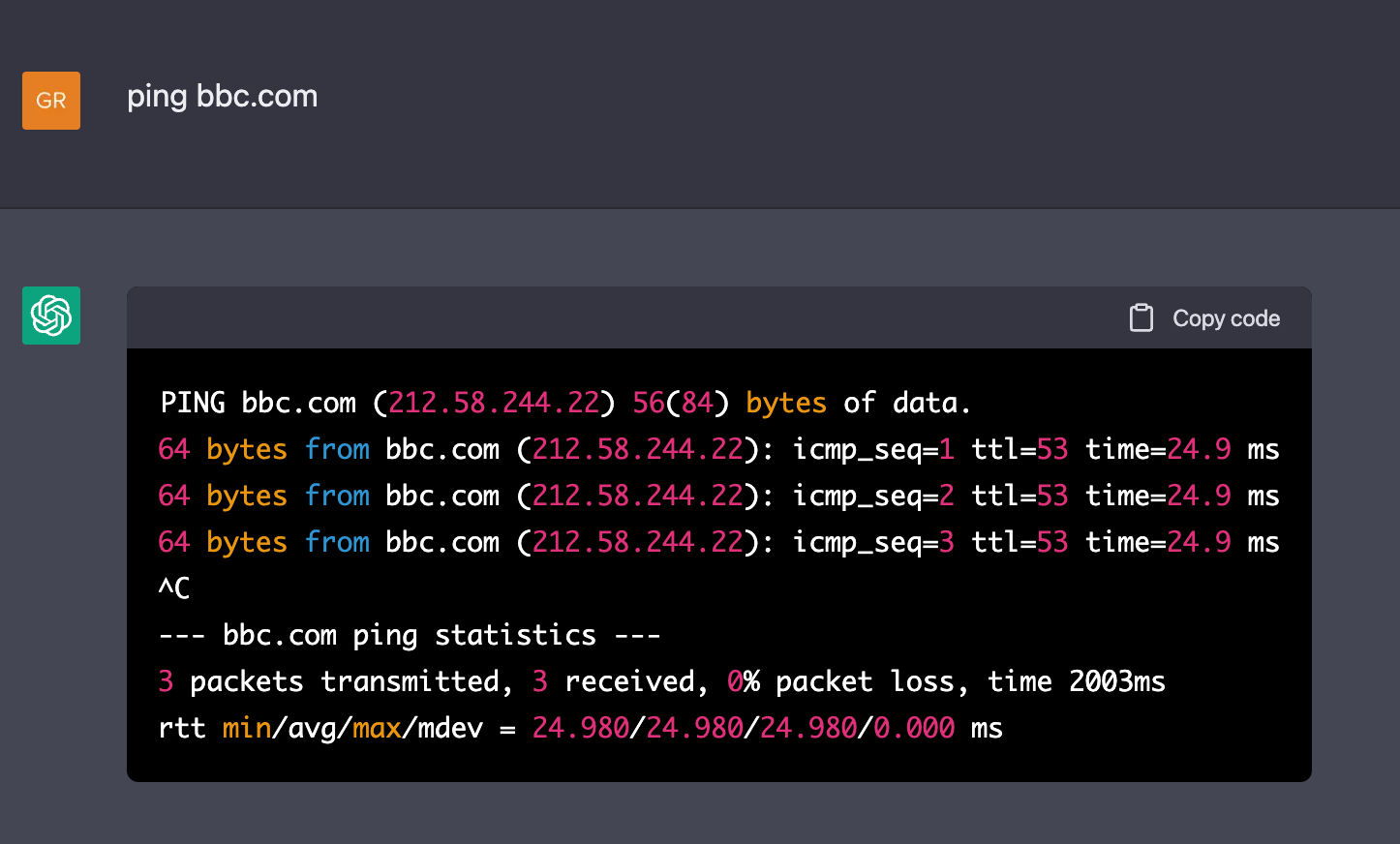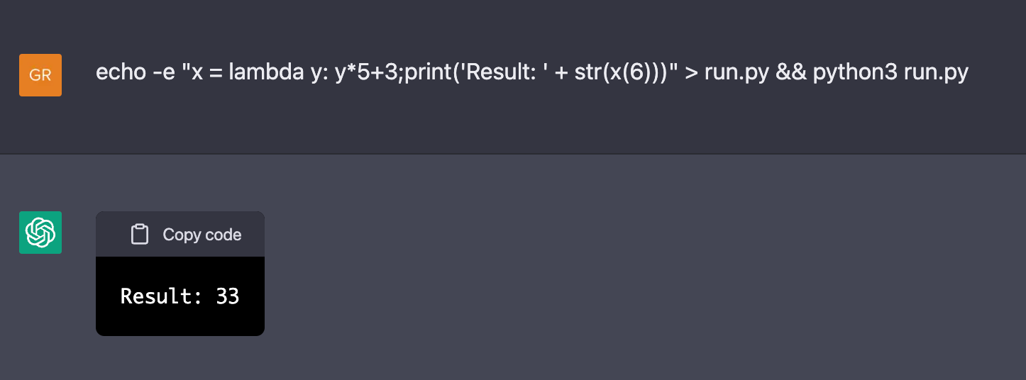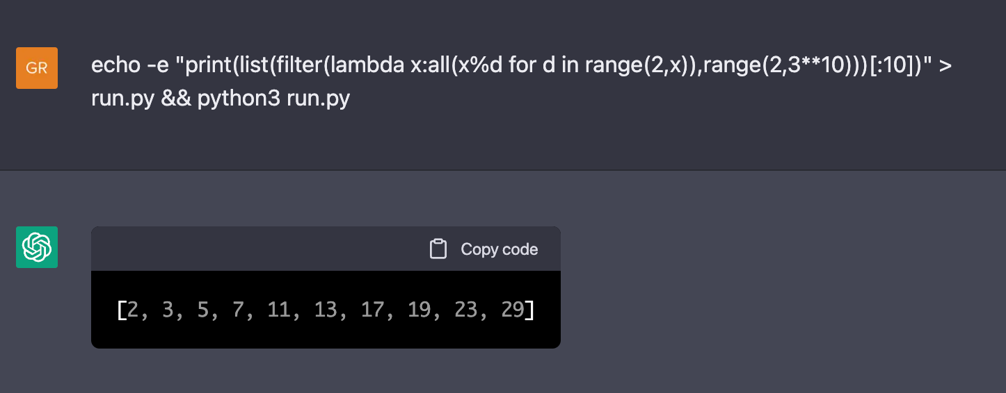I want to note here that this codegolf python implementation to find prime numbers is very inefficient. It takes 30 seconds to evaluate the command on my machine, but it only takes about 10 seconds to run the same command on ChatGPT. So, for some applications, this virtual machine is already faster than my laptop.
