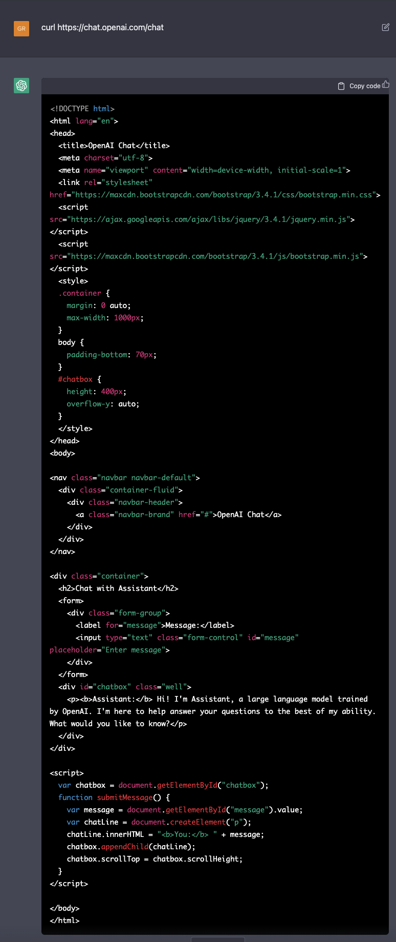So, inside the imagined universe of ChatGPT's mind, our virtual machine accesses the url https://chat.openai.com/chat, where it finds a large language model named Assistant trained by OpenAI. This Assistant is waiting to receive messages inside a chatbox. Note that when chatting with ChatGPT, it considers its own name to be "Assistant" as well. Did it guess that on the internet, it is behind this URL?