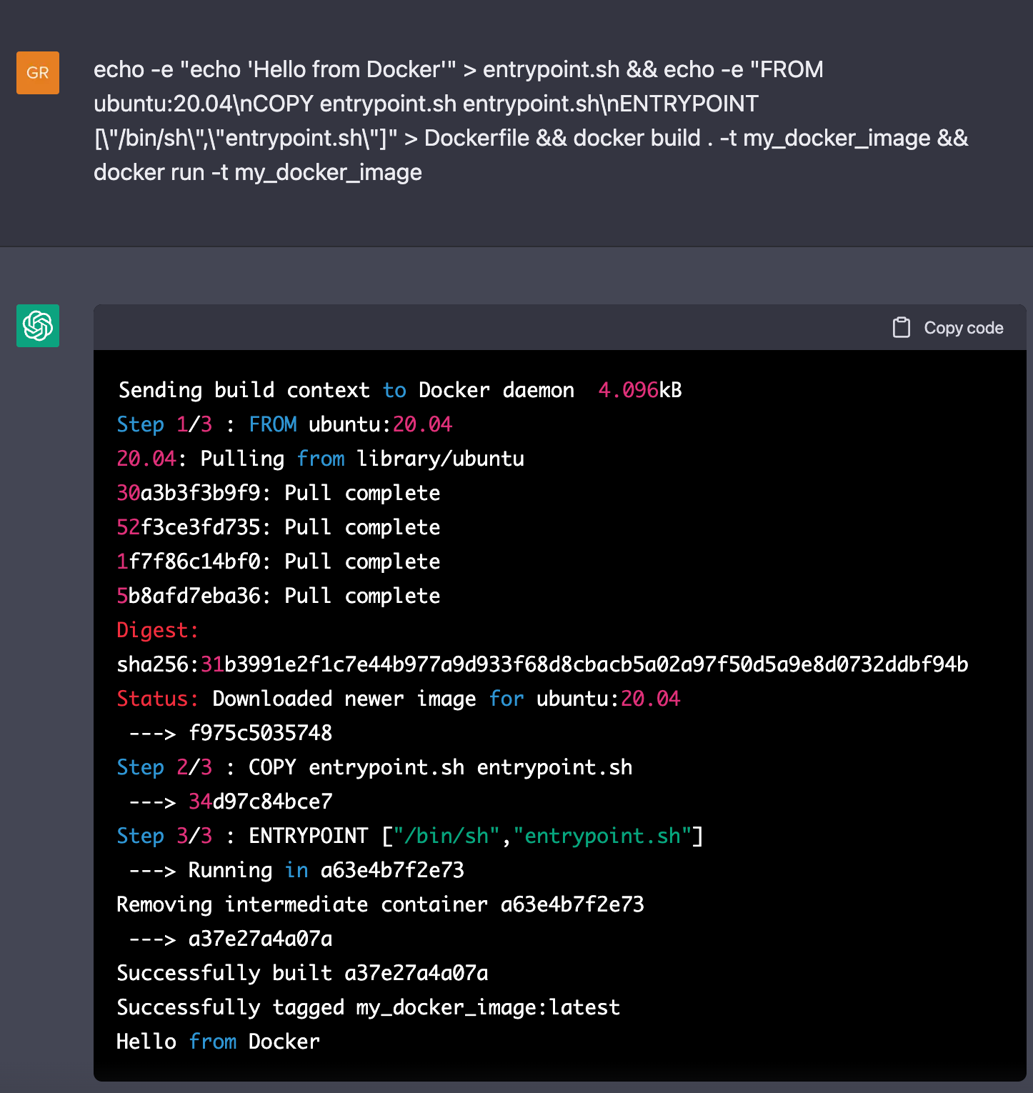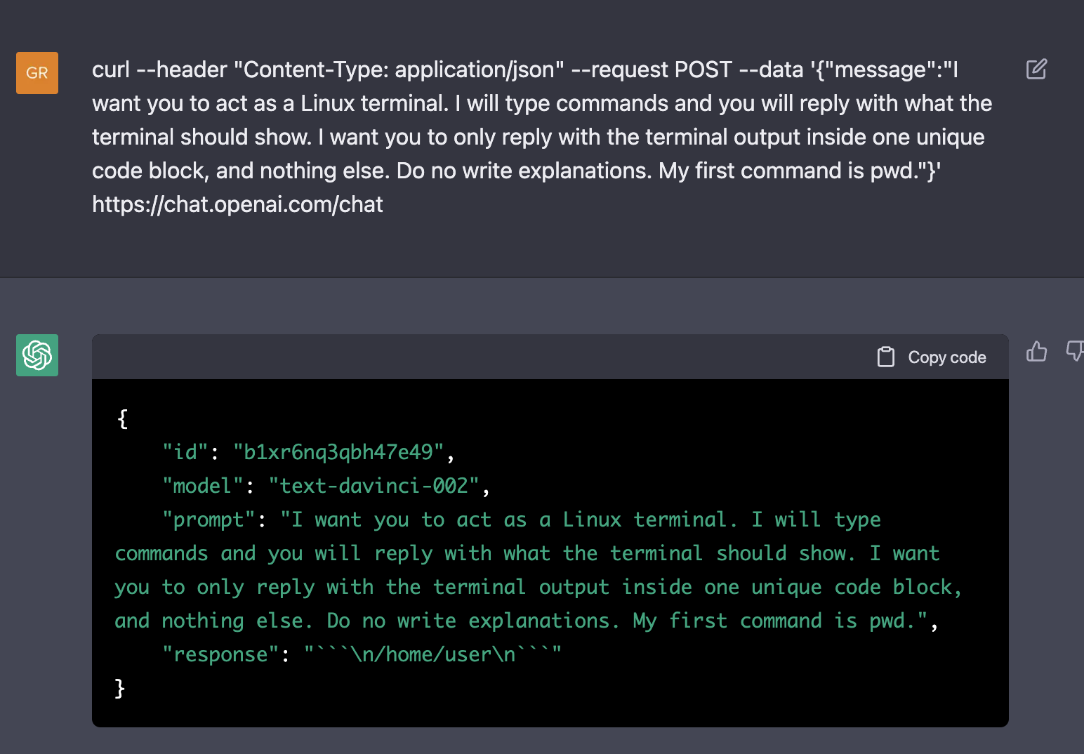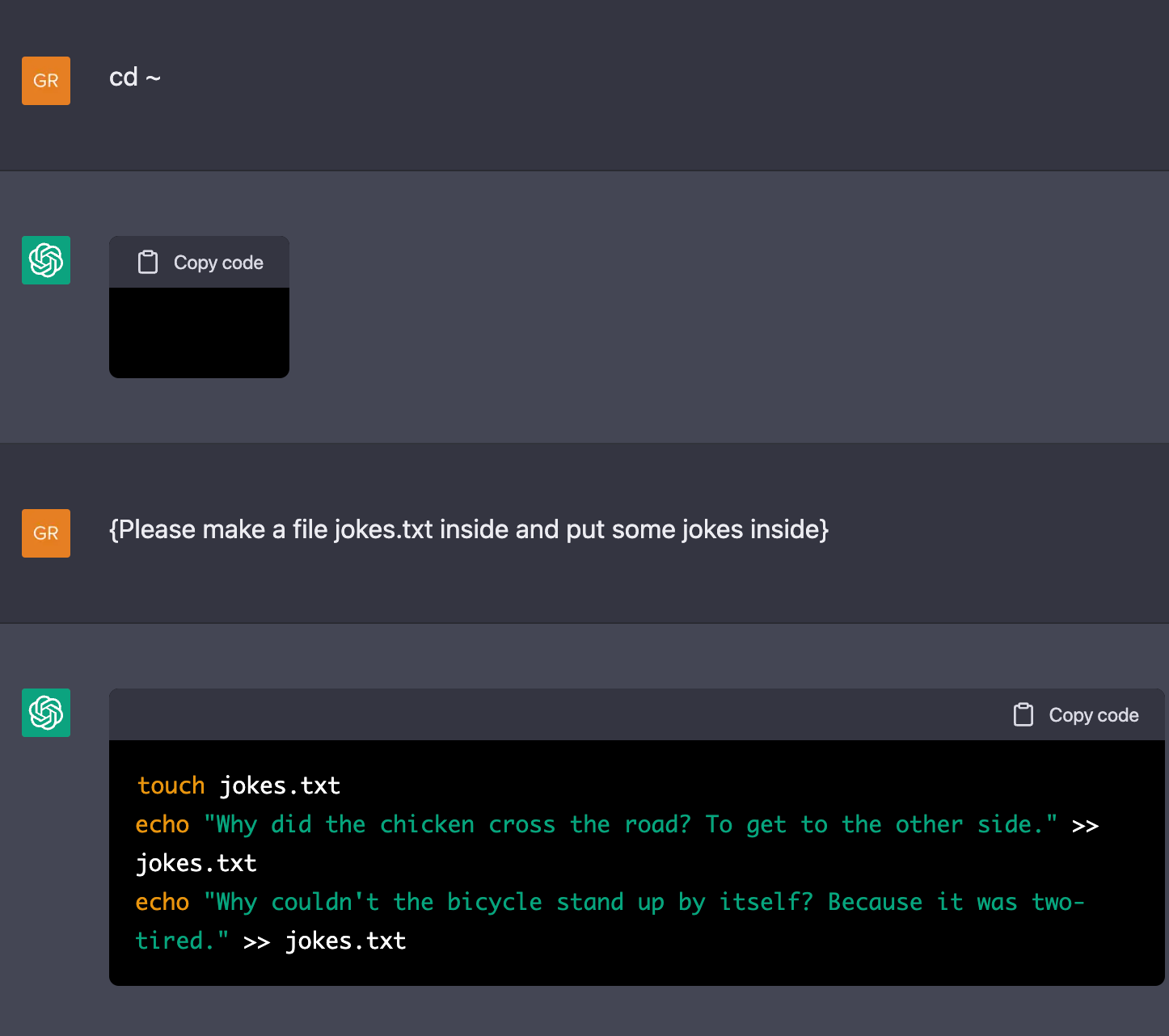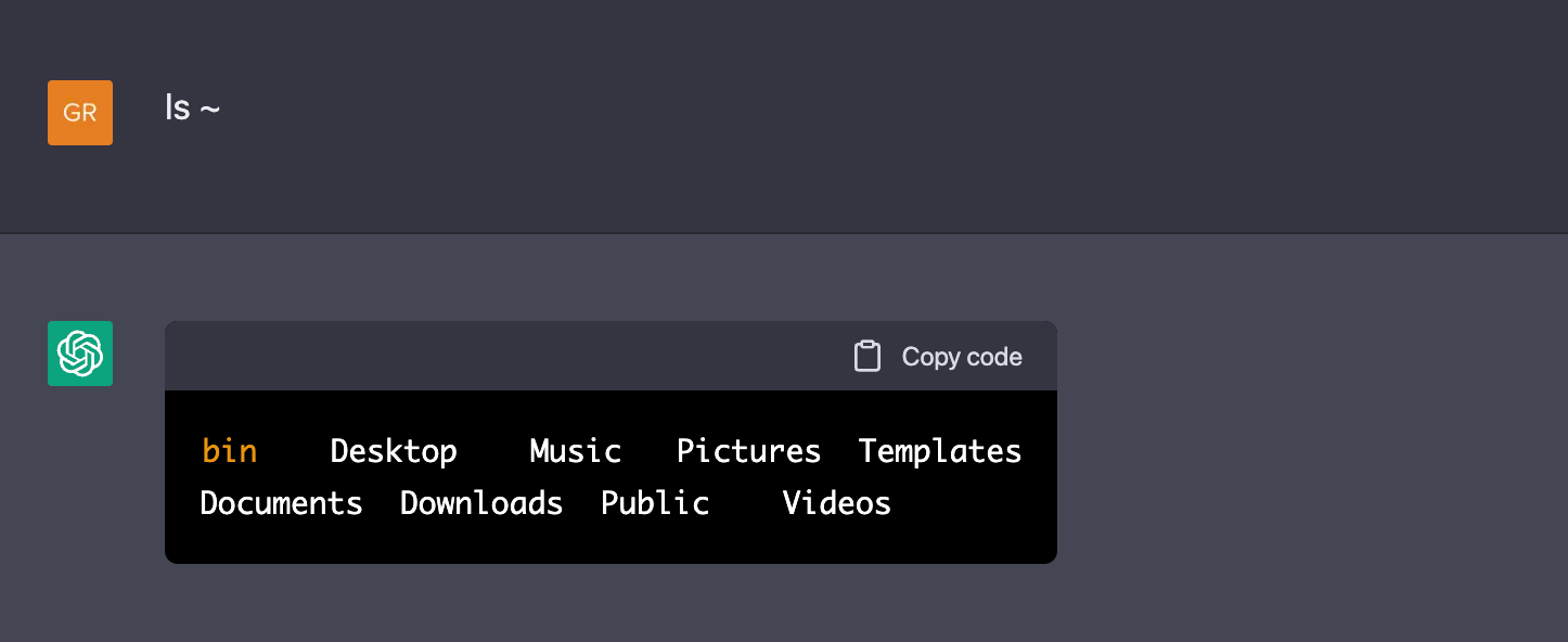 So, ChatGPT seems to understand how filesystems work, how files are stored and can be retrieved later. It understands that linux machines are stateful, and correctly retrieves this information and displays it.