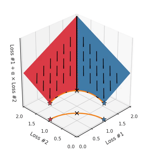 So not only do we have a hyper-parameter α which cannot find all solutions, depending on the initialisation it might find a different convex part of the Pareto curve. To make things even harder to work with, this parameter and the initialisation mix with each other in confusing ways. If you tune your parameter slightly hoping to move the optimum slightly, you can suddenly jump to a different convex part of the Pareto front, even when keeping the initialisation the same.