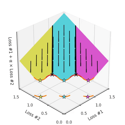 The behaviour we hope to see is that when tuning this α, we can choose the trade-off between the two losses and select the point we are most happy with for our application. We effectively will go on a hyper-parameter tuning loop, manually select an α, run the optimisation process, decide we would like the second loss to be lower, tune our α up accordingly and repeat the whole optimisation process. After several iterations, we settle for the solution we found and continue writing our papers.